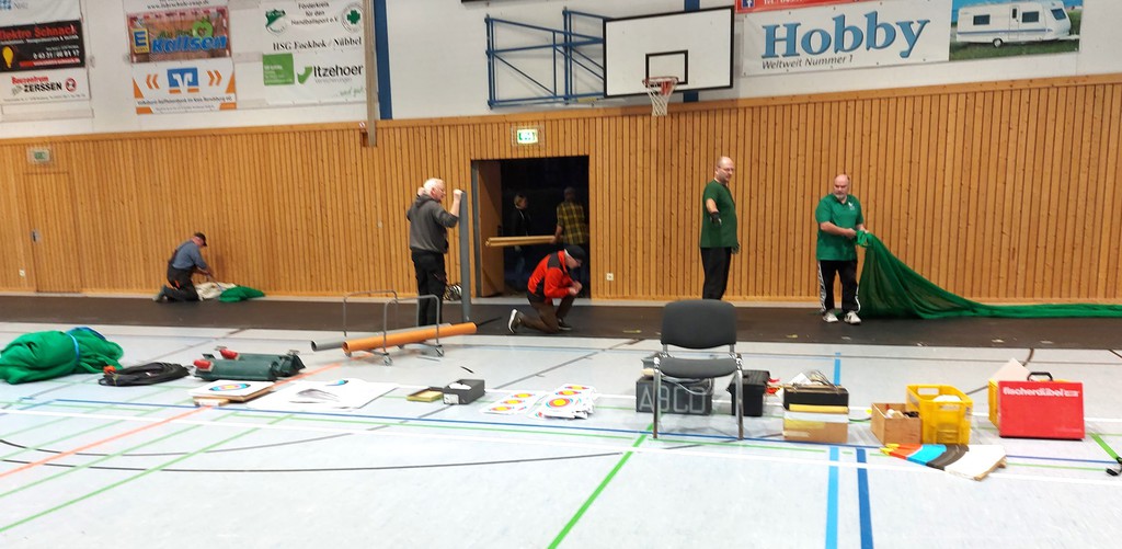 Viele, wirklich viele Sportfreunde und Vereinsmitglieder waren da und haben die Sporthalle für den nächsten Tag vorbereitet. Da wurden Matten ausgerollt, Fangnetze aufgehängt, die Scheiben aufgestellt, Linien gezogen, Technik aufgebaut. Um nur eine Zahl zu nennen: nur für die Gerätelinie und die Startlinie: 4 Personen je 1,5 Stunden. Und die haben die Linien nur geklebt. Die Abstände berechnet wurden da schon vorher.