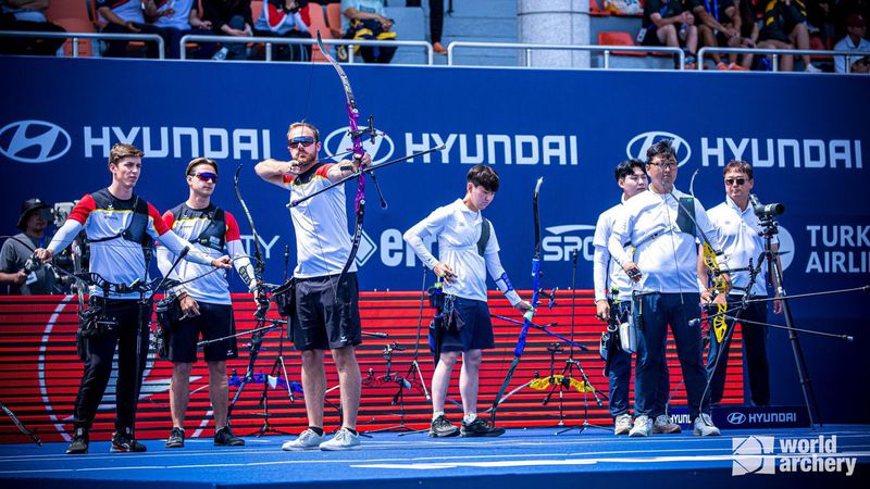 Bereits nach dem ersten Ko-Rundentag beim Weltcup in Yecheon/KOR (21. bis 26. Mai) haben die deutschen Bogenschützen zwei Medaillen sicher: Das Männer-Trio Florian Unruh, Jonathan Vetter und Moritz Wieser schoss sich sensationell in das Goldfinale, die Frauen Katharina Bauer, Michelle Kroppen und Elisa Tartler gewannen Team-Bronze.