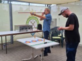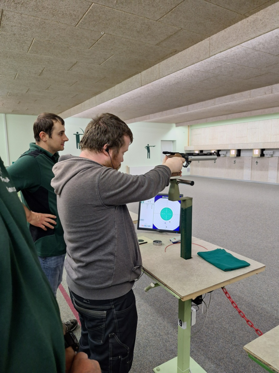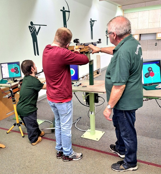 Am 06.08.2025 durften wir 7 Personen, mit ihrem Betreuer Claus Nielsen aus den Rendsburger/Fockbek Werkstätten, begrüßen. Nachdem Gisela Kröger, 2. Vorsitzende, alle begrüßt und die Vorgehensweise erklärt hatte ging es auch schon los. Kristan kümmerte sich um eine Person im Rollstuhl, sie verstanden sich sehr gut und ich glaube er hat sehr viel gelernt. Vor allem hat er super geschossen. Es gab einen "Parkour" mit LG, LP und Blasrohr, jeweils 20 Schuss, später wurden alle Punkte zusammengezogen und der 1.und 2. Preis mit einem Pokal geehrt.